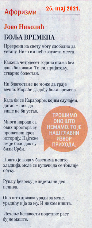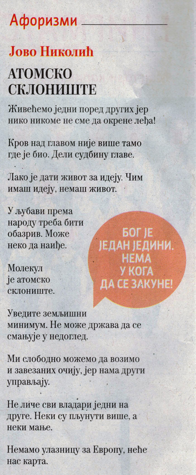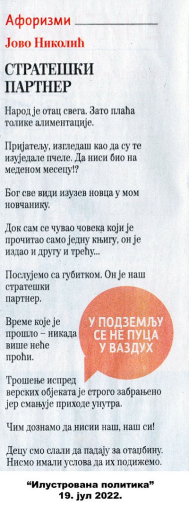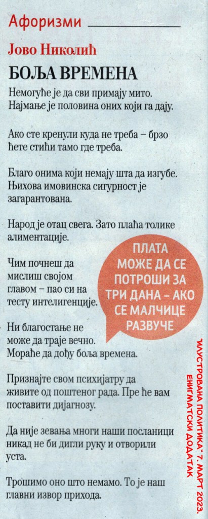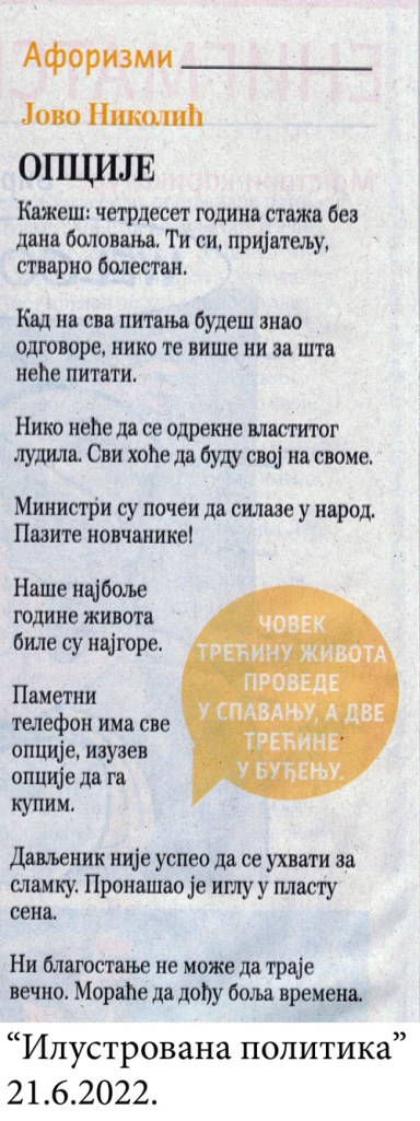 Aforizmi J. Nikolića u „Ilustrovanoj politici“ Objavljeno 23. septembra 2023.3. oktobra 2023. autor: humorisatira Posted in Uncategorized 26. 5. 2020. 27. 4. 2021. Podeli ovo: Click to share on X(Otvara se u novom prozoru) X Kliknite da podelite na Facebook-u(Otvara se u novom prozoru) Fejsbuk Sviđa mi se Učitavanje... Сродно