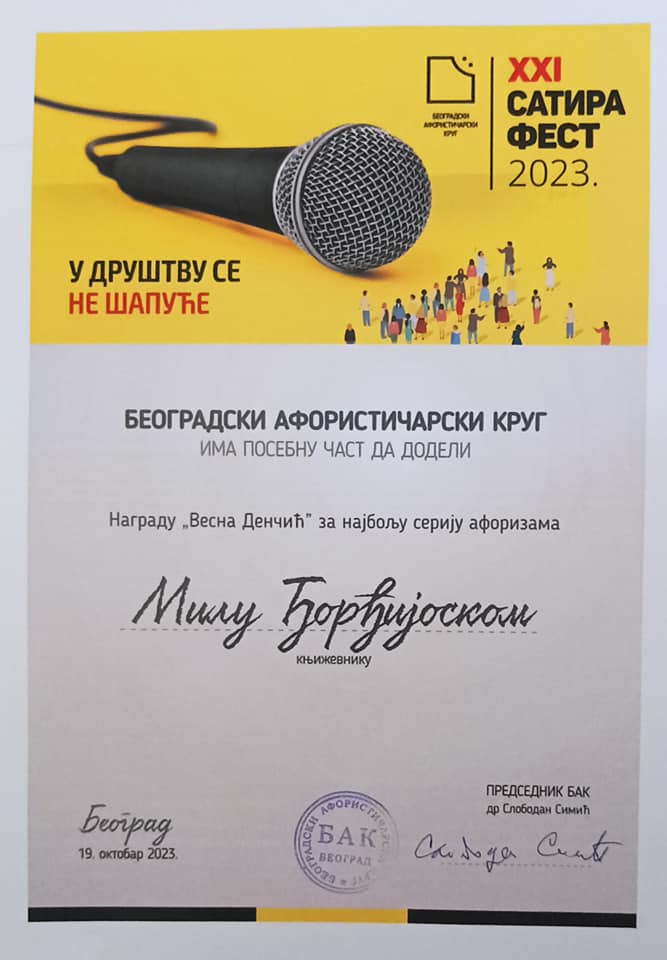 Po prvi put uručena je i nagrada „Vesna Denčić“ – za najbolju seriju aforizama, a nosilac ovog priznanja postao je Mile Đorđijoski iz Delčeva u Severnoj Makedoniji.