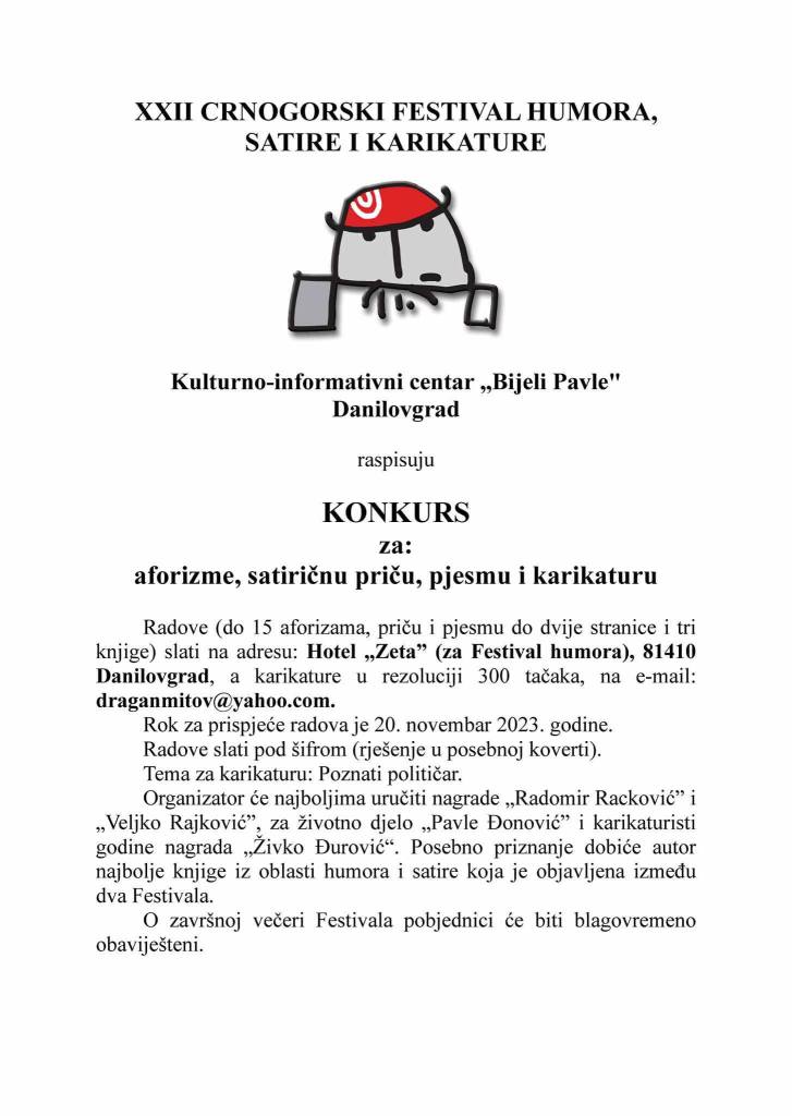 XXII CRNOGORSKI FESTIVAL HUMORA, SATIRE I KARIKATURE Objavljeno 22. oktobra 2023. autor: humorisatira Posted in Uncategorized Podeli ovo: Click to share on X(Otvara se u novom prozoru) X Kliknite da podelite na Facebook-u(Otvara se u novom prozoru) Fejsbuk Sviđa mi se Učitavanje... Сродно