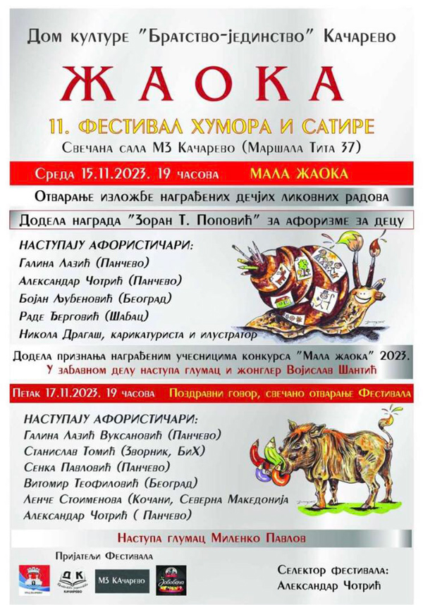 Festival Humora i satire “ŽAOKA” biće održan u petak 17. novembra 2023. godine u Svečanoj sali