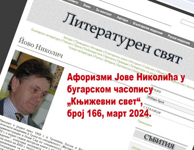 Афоризми Јове Николића у бугарском часопису „Књижевни свет“ Objavljeno 12. marta 2024.12. marta 2024. autor: humorisatira Posted in Uncategorized „Књижевни свет“,број 166, март 2024. Превод: Валентин Димитров „Књижевни свет“ Биографија Ј. Николића „Књижевни свет“ Афоризми Ј. Николића Podeli ovo: Click to share on X(Otvara se u novom prozoru) X Kliknite da podelite na Facebook-u(Otvara se u novom prozoru) Fejsbuk Sviđa mi se Učitavanje... Сродно