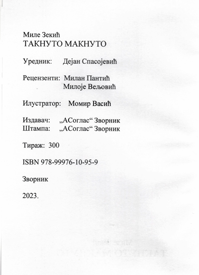 Миле Зекић је један од таквих људи. Увијек је био свјестан својих вриједности, али их је до сада испољавао на друге начине, кроз школовање, посао, породицу, спорт и шах, потомство. И да је хтио, није имао времена да се окушава у нечему, за шта је сматрао да други раде боље. Али, све ове године, а он је већ зашао у седамдесете, уживао је читајући сатиру, а највише афоризме.