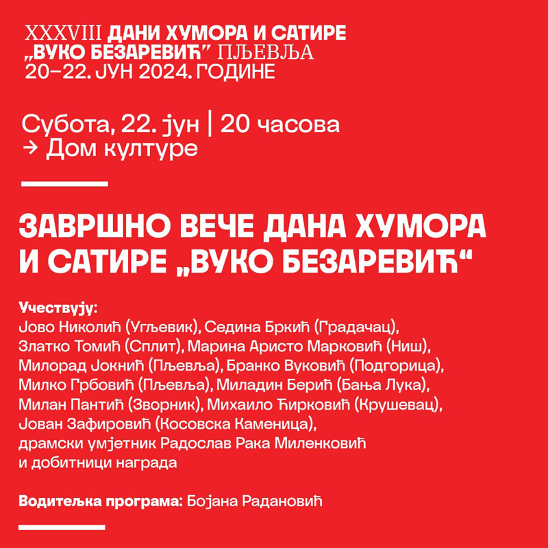 PROGRAM XXXVIII DANA HUMORA I SATIRE VUKO BEZAREVIĆ Objavljeno 14. juna 2024.16. juna 2024. autor: humorisatira Posted in Uncategorized Podeli ovo: Click to share on X(Otvara se u novom prozoru) X Kliknite da podelite na Facebook-u(Otvara se u novom prozoru) Fejsbuk Sviđa mi se Učitavanje... Сродно