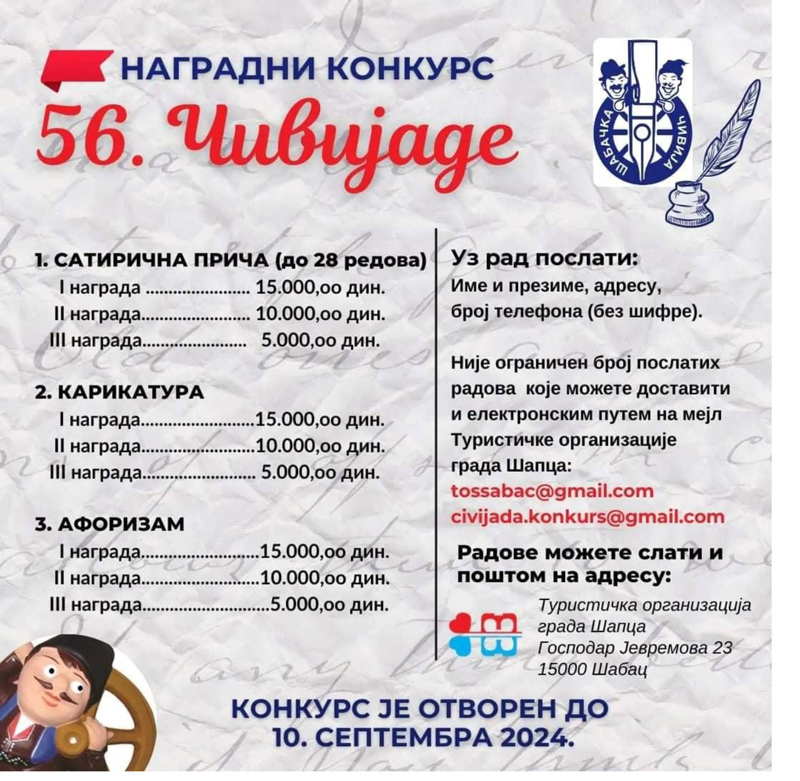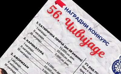 Наградни конкурс 56. Чивијаде у Шапцу Objavljeno 26. avgusta 2024. autor: humorisatira Posted in Uncategorized Podeli ovo: Click to share on X(Otvara se u novom prozoru) X Kliknite da podelite na Facebook-u(Otvara se u novom prozoru) Fejsbuk Sviđa mi se Učitavanje... Сродно