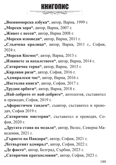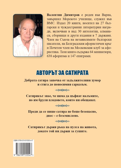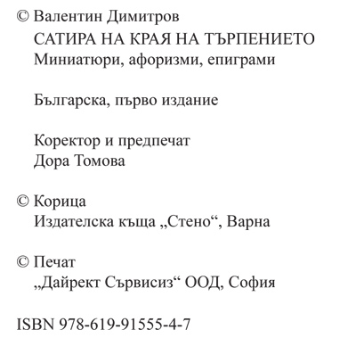 Угледни бугарски књижевник Валентин Димитров објавио је своју 21. књигу под називом САТИРА НА КРАЯ НА ТЪРПЕНИЕТО (Сатира на крају стрпљења) у којој се налазе сатиричне минијатуре, афоризми и епиграми. Дјело је изашло 2024. године и има 200 страница.