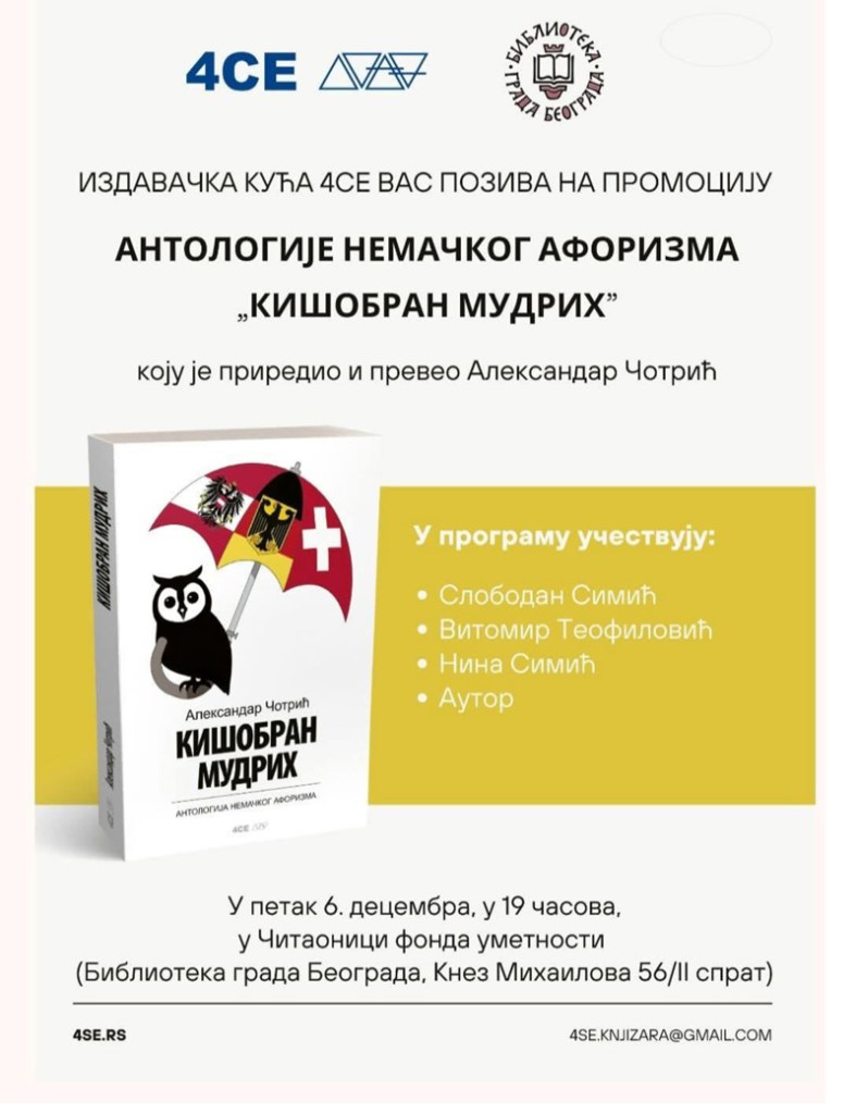 Predstavljanje nedavno objavljene Antologije nemačkog aforizma „Kišobran mudrih“ („4SE“, 2024, Beograd) biće održano u petak, 6. decembra od 19 časova u Biblioteci Beograda, u čitaonici Fonda umetnosti (II sprat), ulica Kneza Mihaila 56 (kod Kalemegdana).