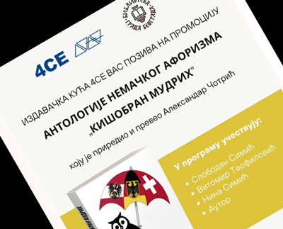 Predstavljanje nedavno objavljene Antologije nemačkog aforizma „Kišobran mudrih“ („4SE“, 2024, Beograd) biće održano u petak, 6. decembra od 19 časova u Biblioteci Beograda, u čitaonici Fonda umetnosti (II sprat), ulica Kneza Mihaila 56 (kod Kalemegdana).