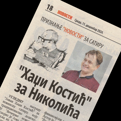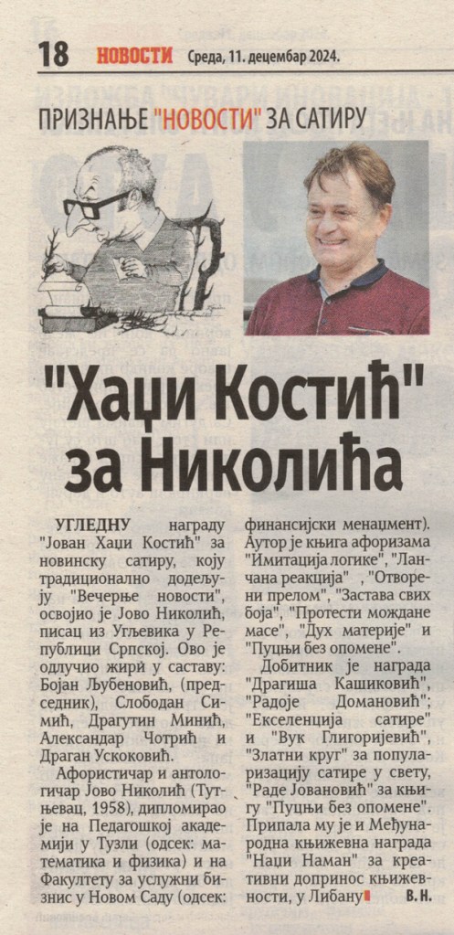 Признање „НОВОСТИ“ за сатиру, „Хаџи Костић“ за Николића Objavljeno 11. decembra 2024.11. decembra 2024. autor: humorisatira Posted in Uncategorized „Новости“ 11. децембар 2024. Podeli ovo: Click to share on X(Otvara se u novom prozoru) X Kliknite da podelite na Facebook-u(Otvara se u novom prozoru) Fejsbuk Sviđa mi se Učitavanje... Сродно
