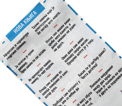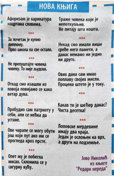 Афоризми из књиге „Редари нереда“, „Вечерње новости“, 9. фебруар 2025. Objavljeno 9. februara 2025. autor: humorisatira Posted in Uncategorized Podeli ovo: Click to share on X(Otvara se u novom prozoru) X Kliknite da podelite na Facebook-u(Otvara se u novom prozoru) Fejsbuk Sviđa mi se Učitavanje... Сродно
