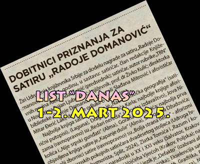 Dobitnici priznanja za satiru „Radoje Domanović“ Objavljeno 2. marta 2025. autor: humorisatira Posted in Uncategorized List „Danas“, 1-2. mart 2025. Podeli ovo: Click to share on X(Otvara se u novom prozoru) X Kliknite da podelite na Facebook-u(Otvara se u novom prozoru) Fejsbuk Sviđa mi se Učitavanje... Сродно