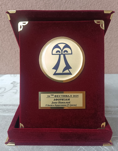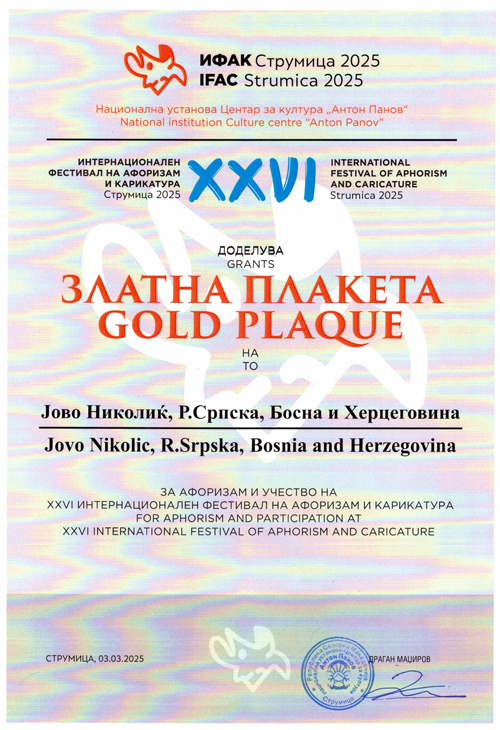 Златна плакета на 26. Међународном фестивалу афоризама и карикатрура у Струмици за Јову Николића Objavljeno 24. aprila 2025.24. aprila 2025. autor: humorisatira Posted in Uncategorized Podeli ovo: Click to share on X(Otvara se u novom prozoru) X Kliknite da podelite na Facebook-u(Otvara se u novom prozoru) Fejsbuk Sviđa mi se Učitavanje... Сродно