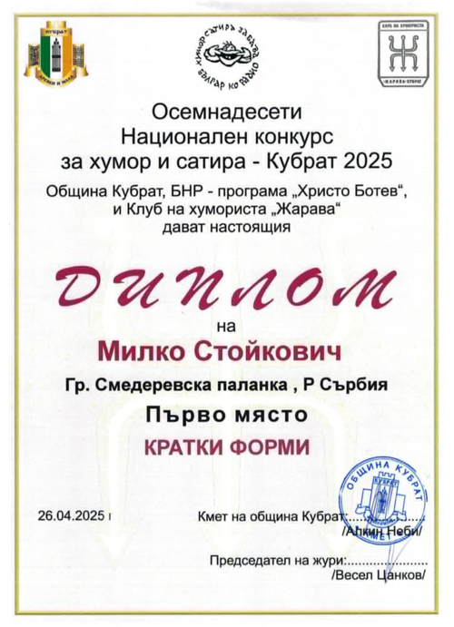 На 18. националном конкурсу за хумор и сатиру – Кубрат 2025 расписаног од општине Кубрат (Бугарска), БНР – програма „Христо Ботев“, Клуба хумориста „Жарава“ а који је завршен 26. 4. 2025. године, сатиричар Милко Стојковић је освојио прво мјесто у категорији кртке форме.