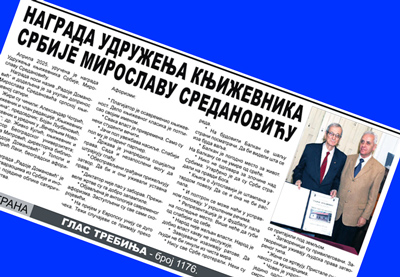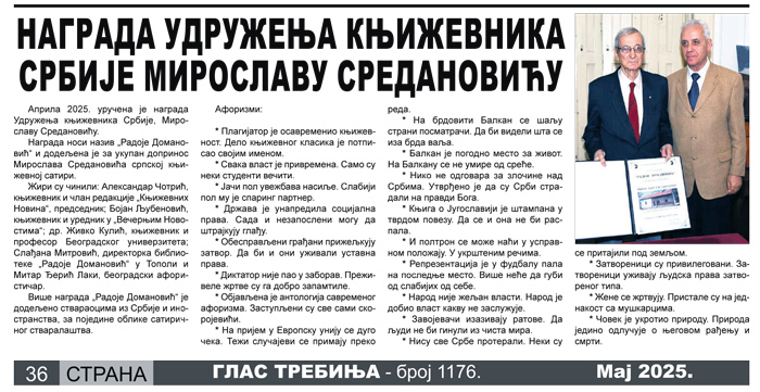 НАГРАДА УДРУЖЕЊА КЊИЖЕВНИКА СРБИЈЕ МИРОСЛАВУ СРЕДАНОВИЋУ Objavljeno 4. juna 2025.4. juna 2025. autor: humorisatira Posted in Uncategorized „ГЛАС ТРЕБИЊА“, БРОЈ 1176, МАЈ 2025. Podeli ovo: Click to share on X(Otvara se u novom prozoru) X Kliknite da podelite na Facebook-u(Otvara se u novom prozoru) Fejsbuk Sviđa mi se Učitavanje... Сродно