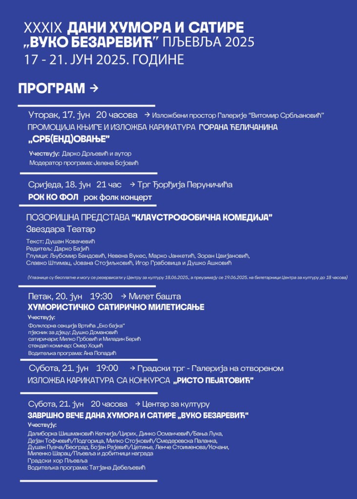 XXXIX ДАНИ ХУМОРА И САТИРЕ „ВУКО БЕЗАРЕВИЋ“ ПЉЕВЉА 2025 Objavljeno 13. juna 2025. autor: humorisatira Posted in Uncategorized Podeli ovo: Click to share on X(Otvara se u novom prozoru) X Kliknite da podelite na Facebook-u(Otvara se u novom prozoru) Fejsbuk Sviđa mi se Učitavanje... Сродно