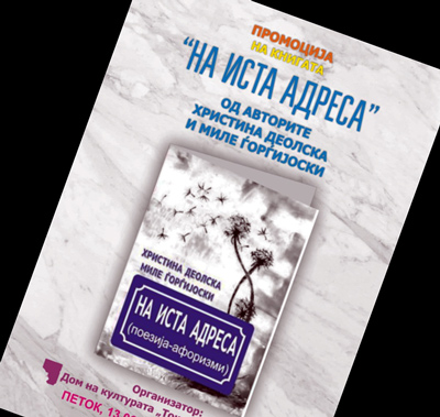 У Дому култура ,,Тошо Арсов“ Виница (Сјеверна Македонија) 13. 6. 2025. године одржана је промоција књиге ,,НА ИСТУ АДРЕСУ“ која представља поезију Христине Деолске и афоризама Мила Ђорђијоског.