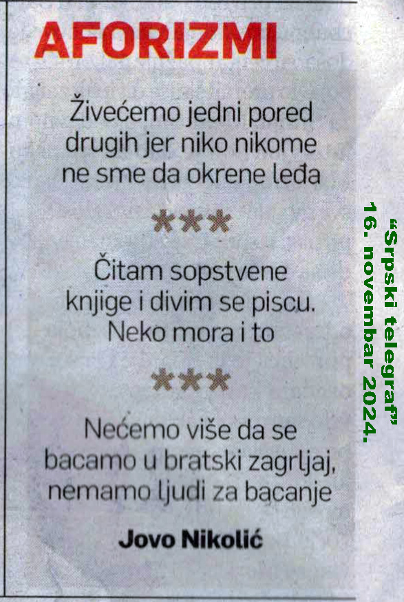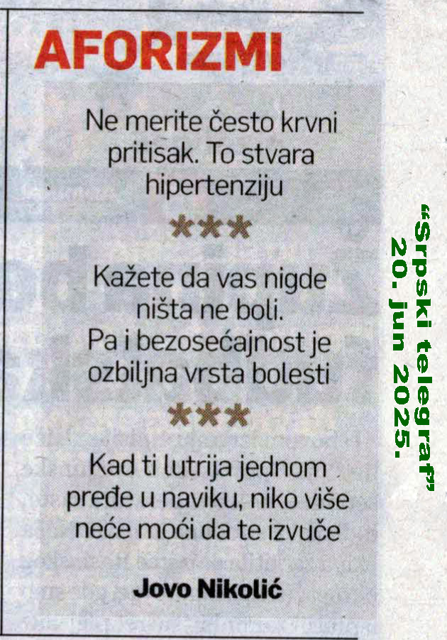 Aforizmi Jove Nikolića u „Srpskom telegrafu“ Objavljeno 20. juna 2025.20. juna 2025. autor: humorisatira Posted in Uncategorized Podeli ovo: Click to share on X(Otvara se u novom prozoru) X Kliknite da podelite na Facebook-u(Otvara se u novom prozoru) Fejsbuk Sviđa mi se Učitavanje... Сродно