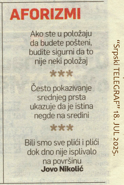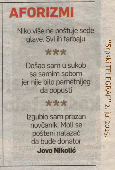 Aforizmi Jove Nikolića u „Srpskom TELEGRAFU“ Objavljeno 18. jula 2025.18. jula 2025. autor: humorisatira Posted in Uncategorized Podeli ovo: Click to share on X(Otvara se u novom prozoru) X Kliknite da podelite na Facebook-u(Otvara se u novom prozoru) Fejsbuk Sviđa mi se Učitavanje... Сродно