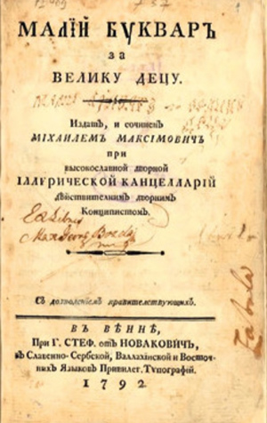 Период просвећености на европском континету, осим што је на простору књижевности изабрао „моралну филозофију за свој центар”, у афоризмима је пронашао дискурс који је одговарао захтевима епохе. У том смислу афористички начин изражавања у српској литератури, управо се у периоду просвећености појављује и везује за име Михаила Максимовића, аутора прве српске књиге афоризама – „Мали буквар за велику децу“, која је штампана је далеке 1792. године на славеносербском језику у Бечу, у штампарији Стефана Новаковића. Поређења ради, прва књига афоризама на руском језику појавила се 1815. године.