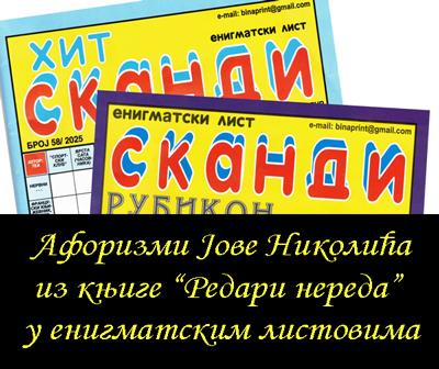 Енигматски листови „Сканди рубикон“ број 60/25 и „Хит сканди“ број 58/25 објавили су афоризме из књиге „Редари нереда“ Јове Николића (33+29) укупно 62. Који афоризми су у питању је енигма док не набавите листове и прочитате.