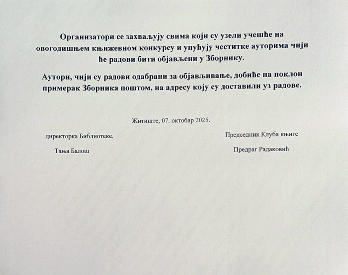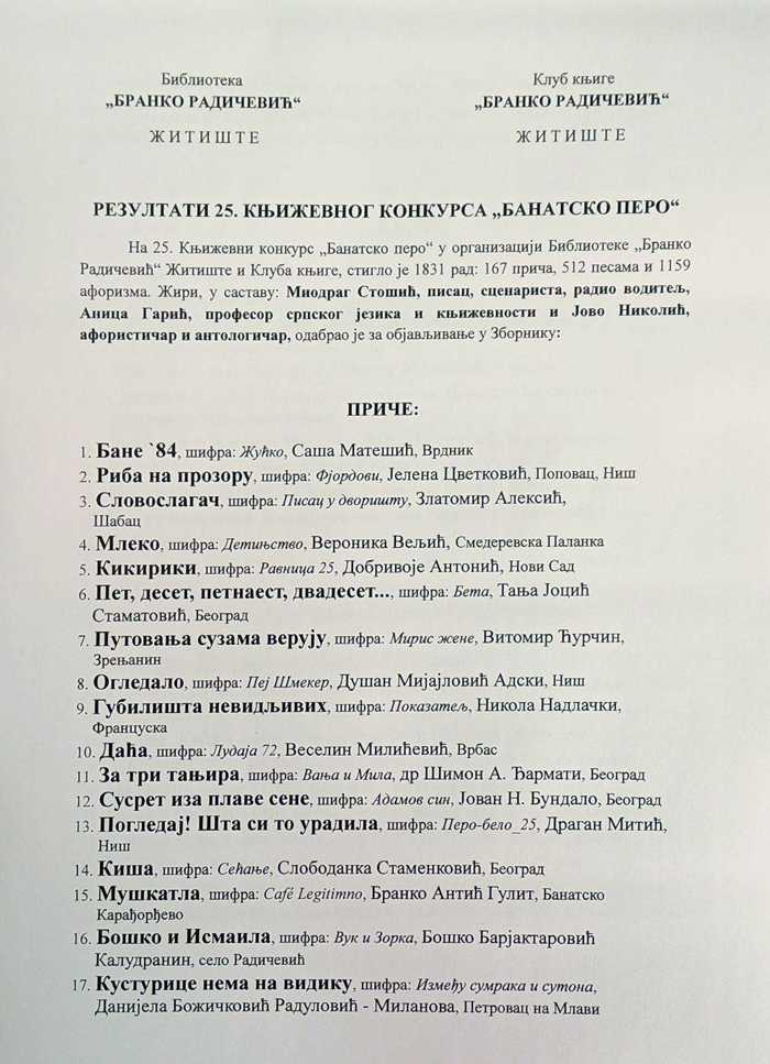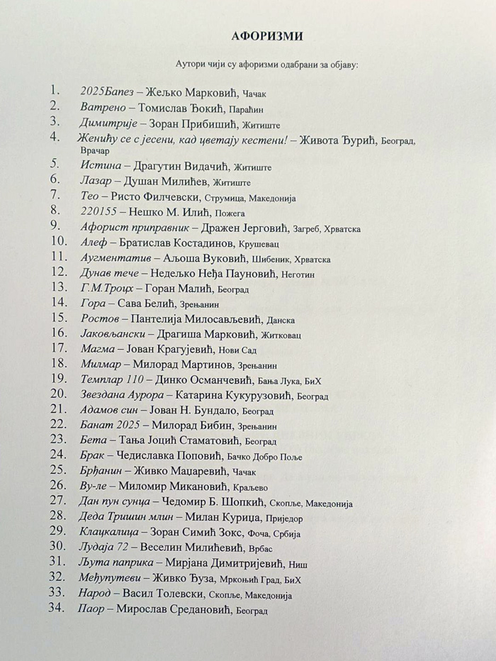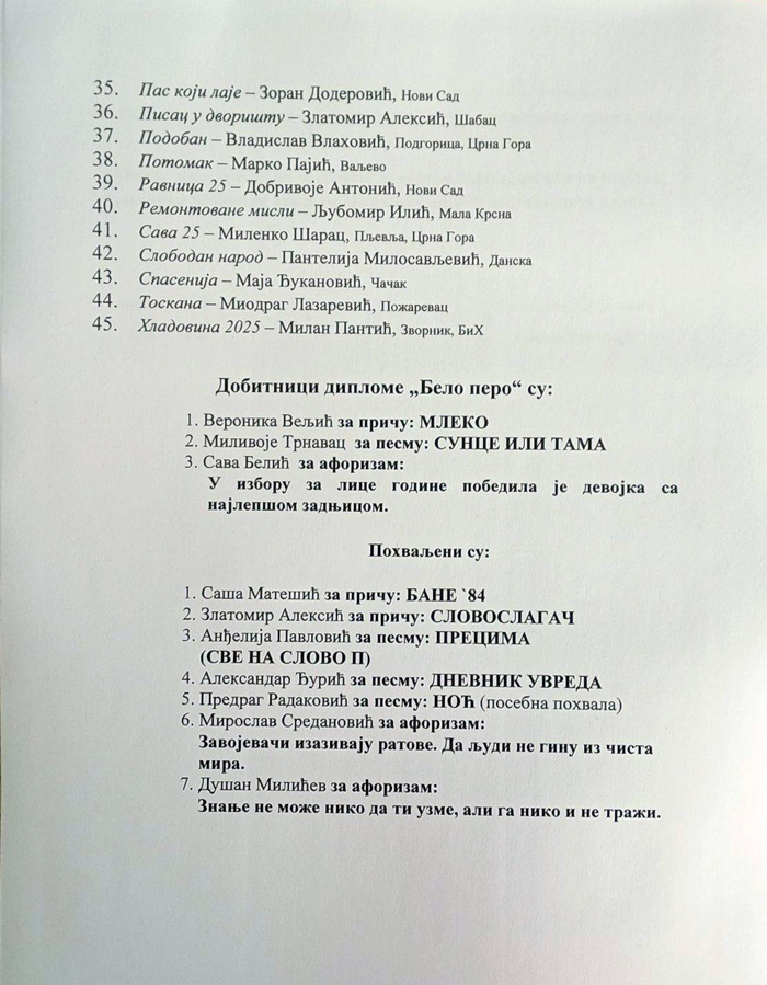 РЕЗУЛТАТИ 25. КЊИЖЕВНОГ КОНКУРСА „БАНАТСКО ПЕРО“ Objavljeno 8. oktobra 2025.8. oktobra 2025. autor: humorisatira Posted in Uncategorized Podeli ovo: Click to share on X(Otvara se u novom prozoru) X Kliknite da podelite na Facebook-u(Otvara se u novom prozoru) Fejsbuk Sviđa mi se Učitavanje... Сродно