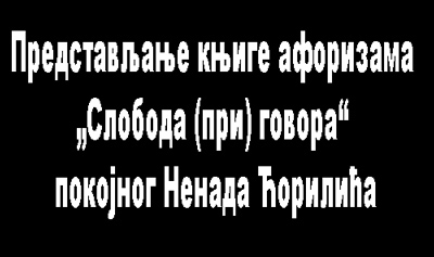 Представљање књиге афоризама „Слобода (при) говора“ покојног Ненада Ћорилића . Говоре: Слободан Симић, Бојан Љубеновић, Александар Чотрић, Витомир Теофиловић, Драгутин Минић Карло, Раде Ђерговић, Недељко Попадић и отац Љубомир Ћорилић. Уредник трибине Видак М. Масловарић.