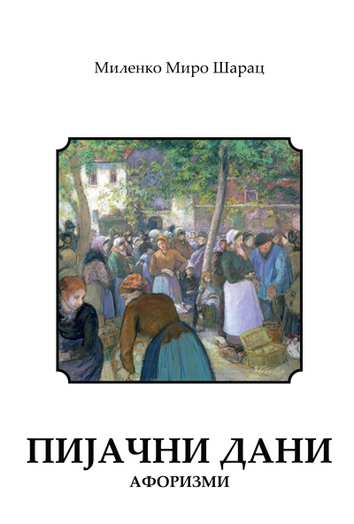 Књига „Пијачни дани“познатог, и на књижевној сцени све присутнијег књижевника Миленка Шарца, нови је очекиван и препознатљив бљесак ума бескомпромисног мајстора кратке форме, који буди наду да афоризам као књижевна форма не може и неће изгубити снагу и смисао, колико год нам обесмишљавали животе и све оно за шта се боримо свјесни или несвјесни да тога заправо одавно нема. Ове сентенце мисаоно и умјетнички до савршенства извајане, прецизно избрушене до рјешавања сваке сувишности стрпљиво су ткане с намјером да се не прескочи нити једна антиврлина, антивријеме, антистање или антихерој, да се не дотакне и жигоше на неки нов и до сада не третиран начин, тако да би могли сматрати наивним став да постоје истрошене теме које су већ обрађене на све могуће начине, на које се могло нешто саопштити, или се иновативно према њима одредити.