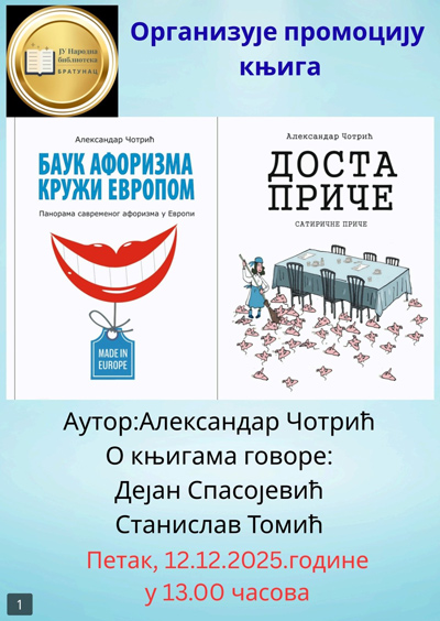 U Narodnoj biblioteci u Bratuncu, u petak, 12. decembra 2025, s početkom u 13 časova biće predstavljene dve knjige pisca iz Pančeva Aleksandra Čotrića: zbirka satiričnih priča „Dosta priče“ (ASoglas izdavaštvo, Zvornik, 2025) i panorama savremenog aforizma u Evropi „Bauk aforizma kruži Evropom“ (IK „Alma“ i Gradska biblioteka Pančevo, Beograd/Pančevo, 2025).