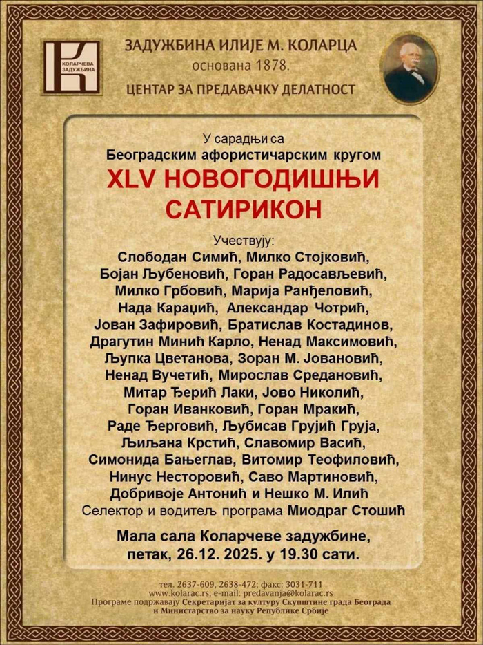 У организацији Београдског афористичарског круга четрдесет пети Новогодишњи сатирикон биће одржан 26. децембра 2025, с почетком у 19.30 у малој сали Задужбине Илије М. Коларца, Студентски трг 5, у Београду.